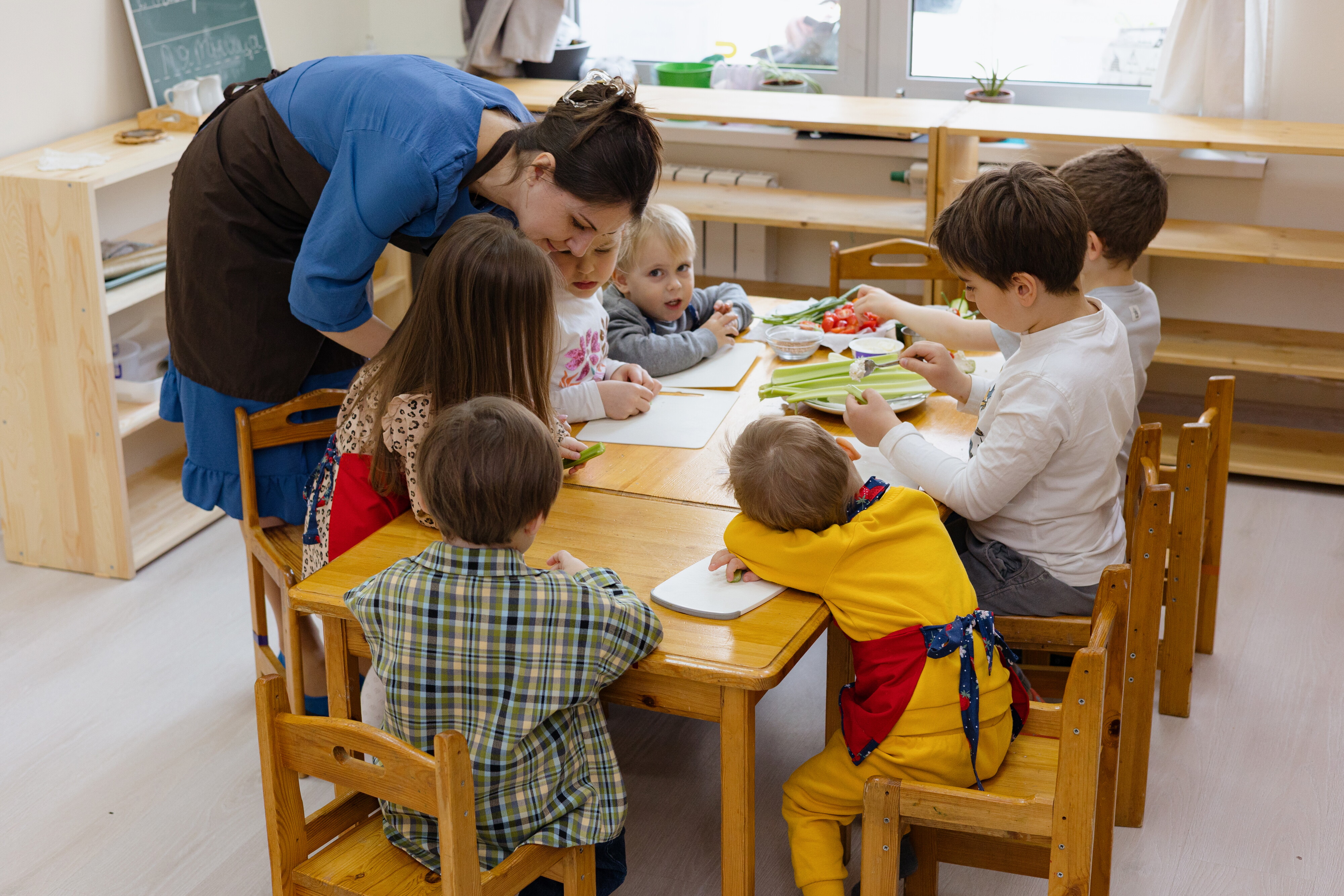 Изначально смущала группа в 25 детей, но на деле оказалось, что в методе Монтессори это абсолютно не страшно! Группа разновозрастная, больше половины ребят уже постарше, они достаточно самостоятельны и не требуют постоянной включённости взрослых. Внимание основных педагогов уделяется малышам столько, сколько им нужно. А педагогов целых три! Один из которых англоязычный.